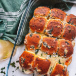 Add buns to baking dish + cut in half. Place chicken on top of bottom buns, followed by vodka sauce + sliced mozzarella + parm cheese and chopped basil. Place the top of buns on top of the chicken. In a bowl, mix together butter, garlic, 2 tbsp basil + parm cheese. Brush mixture on top of the buns.
