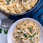 1. Bring a large pot of salted water to boil. Add fettuccine and cook for 2 minutes under the box instructions. Reserve 1/4 cup pasta water.2. In a large saucepan, melt butter and add garlic. Add cream and slowly whisk in flour. Mix together until the sauce has no bumps. Add salt & pepper. Add in 1 cup Parmesan cheese. Mix together.3. Drain pasta and immediately run pasta under cold water.4. Once sauce has a thick texture, add in pasta and mix together until all noodles are coated. Add in pasta water and mix together. Garnish with salt, pepper, freshly grated Parmesan cheese & parsley. Enjoy!
