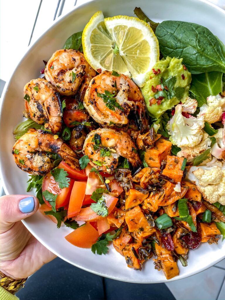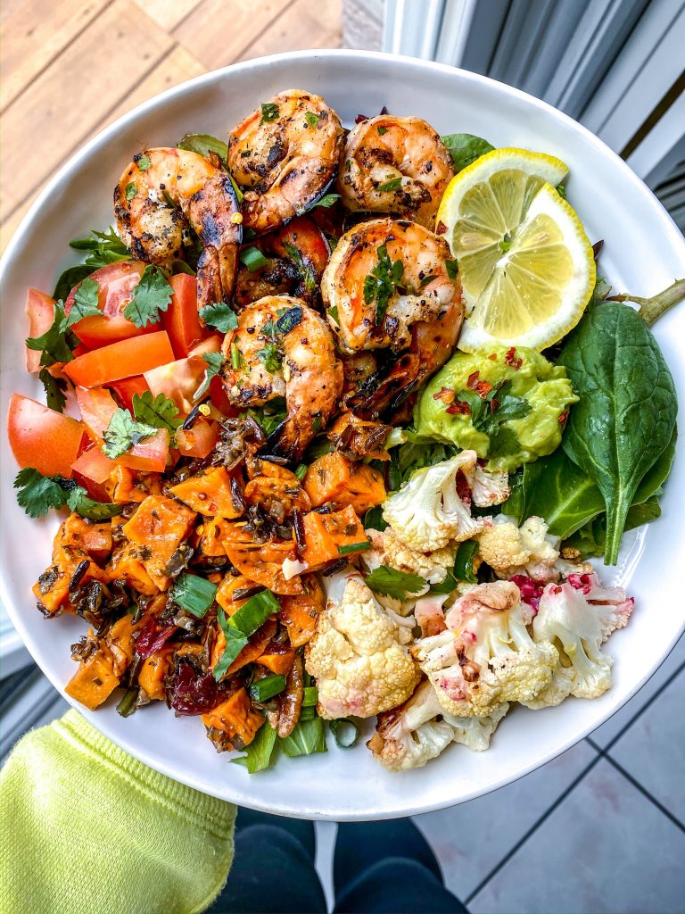 Today, I made my βkitchen sinkβ salad – basically whatever is in my fridge + leftovers and throw it into a big bowl with some lettuce. In the salad I have my BBQ lemon garlic shrimp, fresh tomatoes + cilantro, roasted cauliflower with beet tahini, homemade guacamole and roasted sweet potatoes! Topped with a tiny bit of EVOO and freshly squeezed lemon. Recipe for all of the salad elements below! Donβt forget to save + share the recipe! π xx